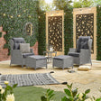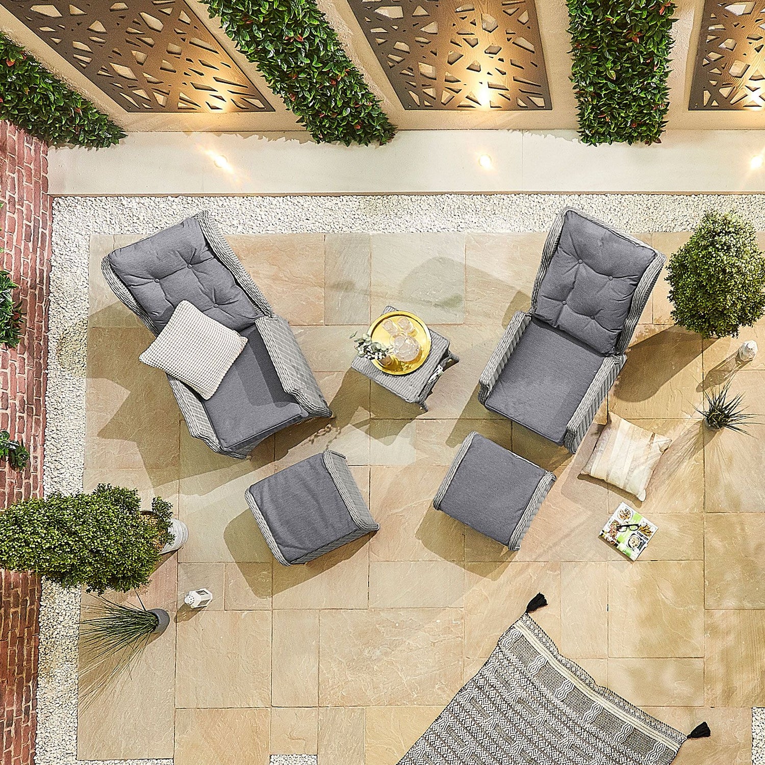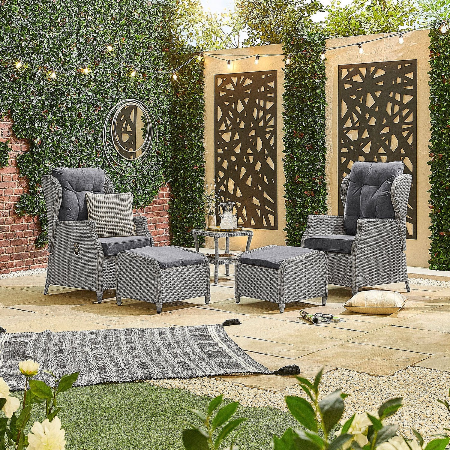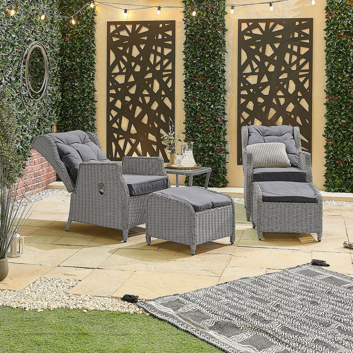 Incorporating two reclining armchairs, two cushioned footstools, and a compact coffee table, this lounge set is perfect for unwinding with a companion while enjoying drinks and snacks in the garden. The reclining chairs, complete with a convenient lever on the side, provide multiple seating positions for maximum relaxation, allowing you to put your feet up and truly unwind.