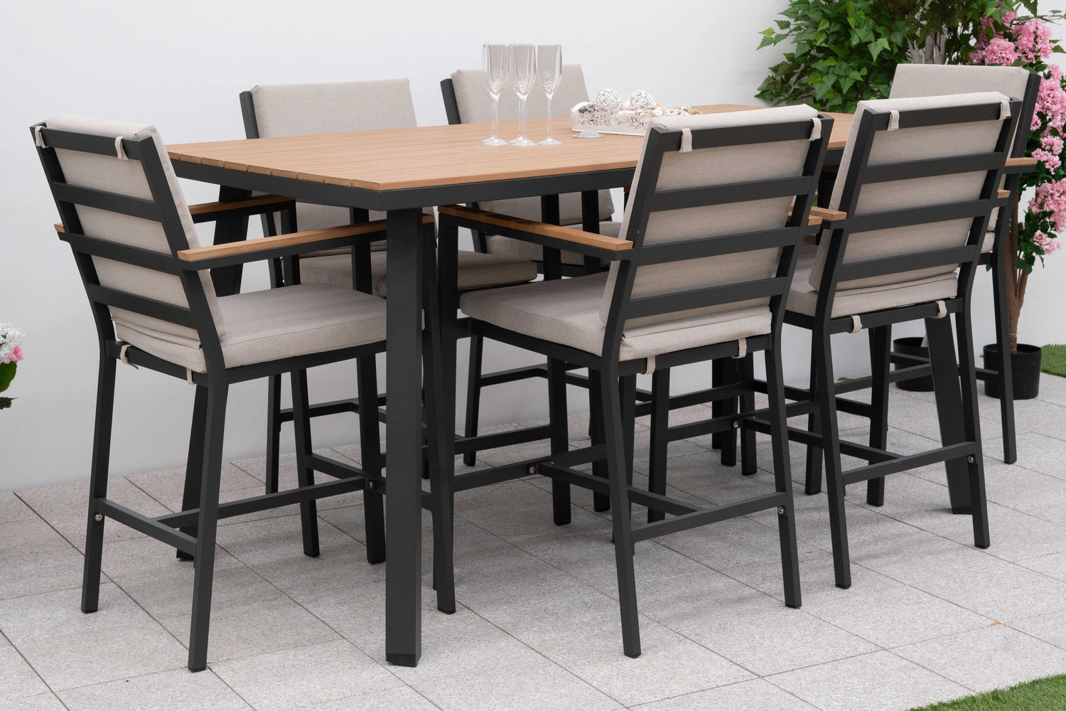 This modern set features a spacious 1.8 x 1.0m rectangular table paired with six comfortable high dining chairs designed for relaxed, elevated meals and gatherings. Crafted with low-maintenance polywood accents made from 100% recycled plastics, the set offers the warmth of wood without the upkeep, making it an eco-friendly choice.