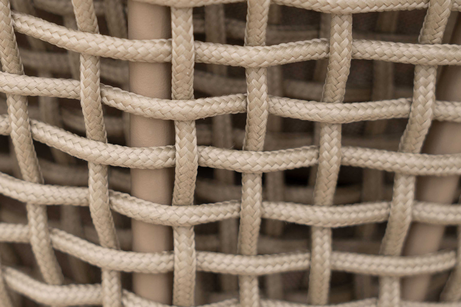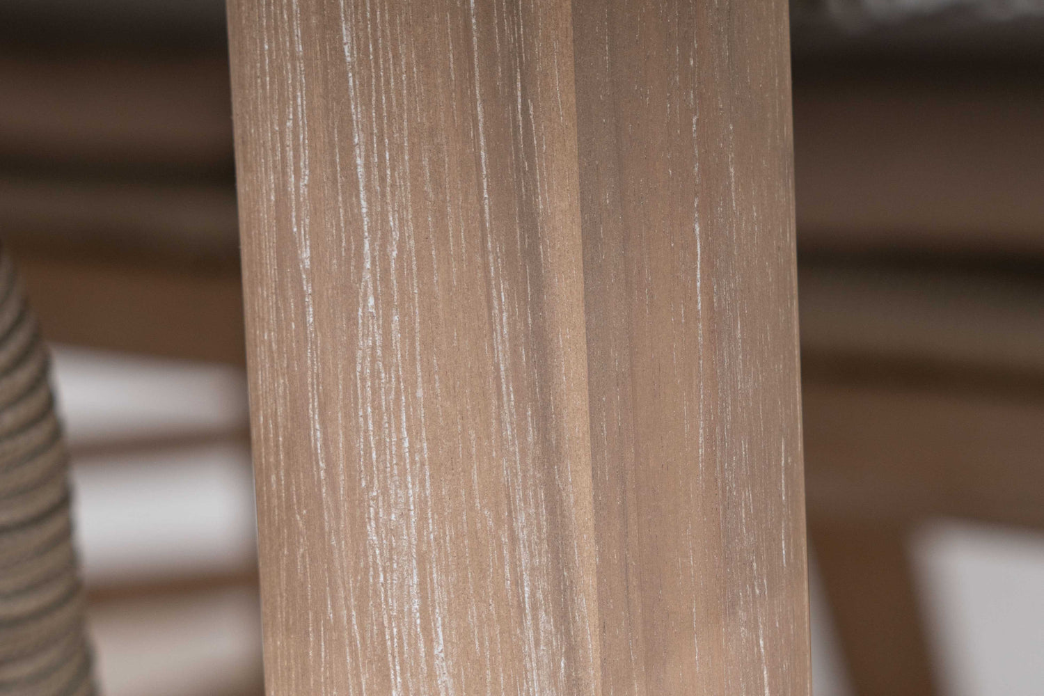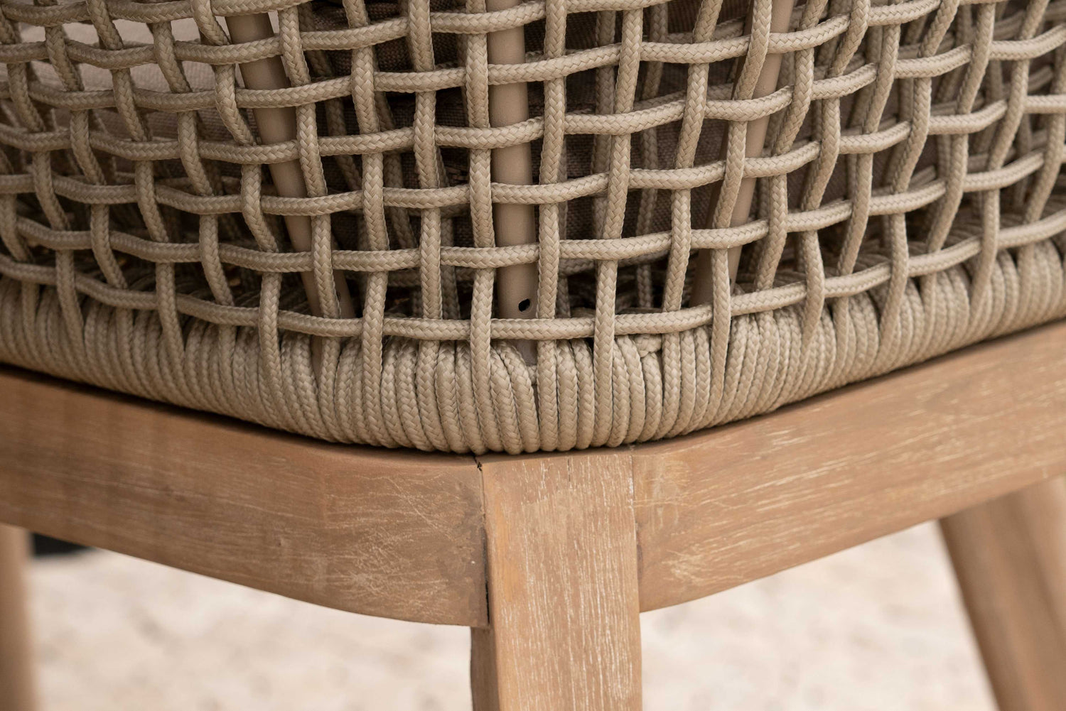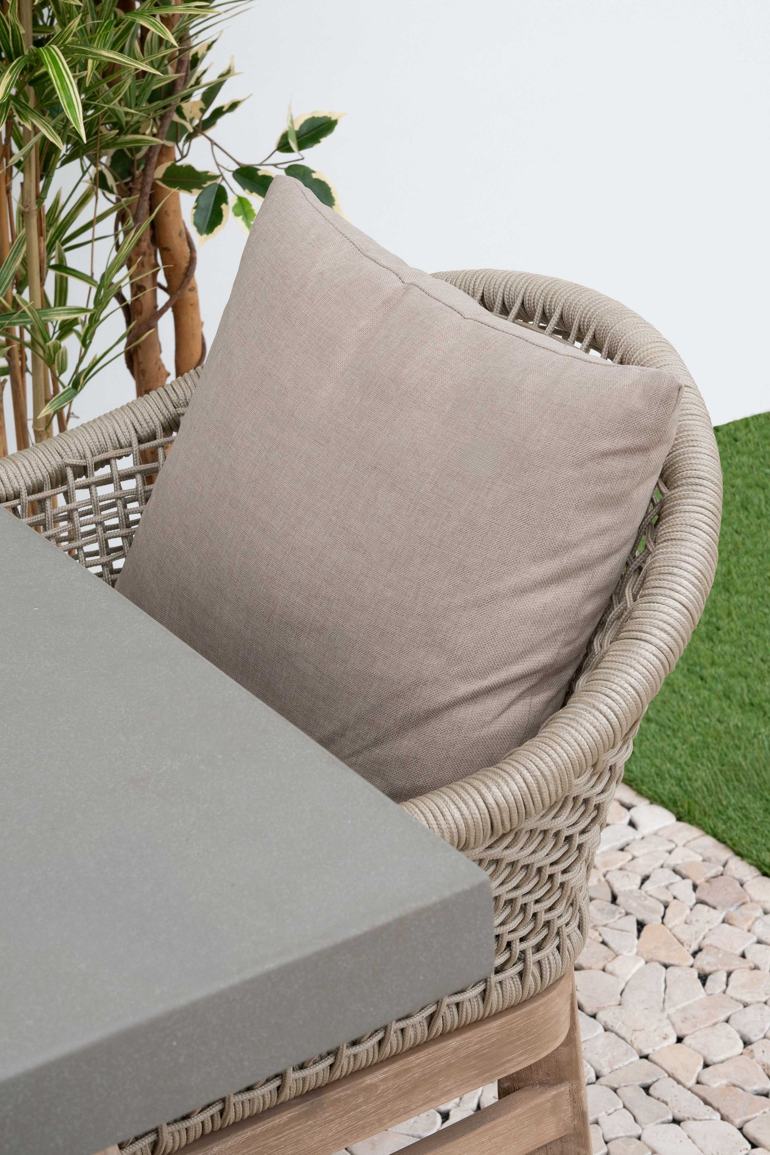 Built with a sturdy aluminium frame and stylish rope detailing, the set offers exceptional durability while maintaining a refined, contemporary look. The warm wooden tones and soft beige cushions create an inviting atmosphere, blending seamlessly with any garden or patio setting.