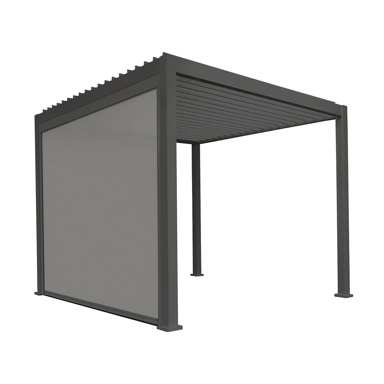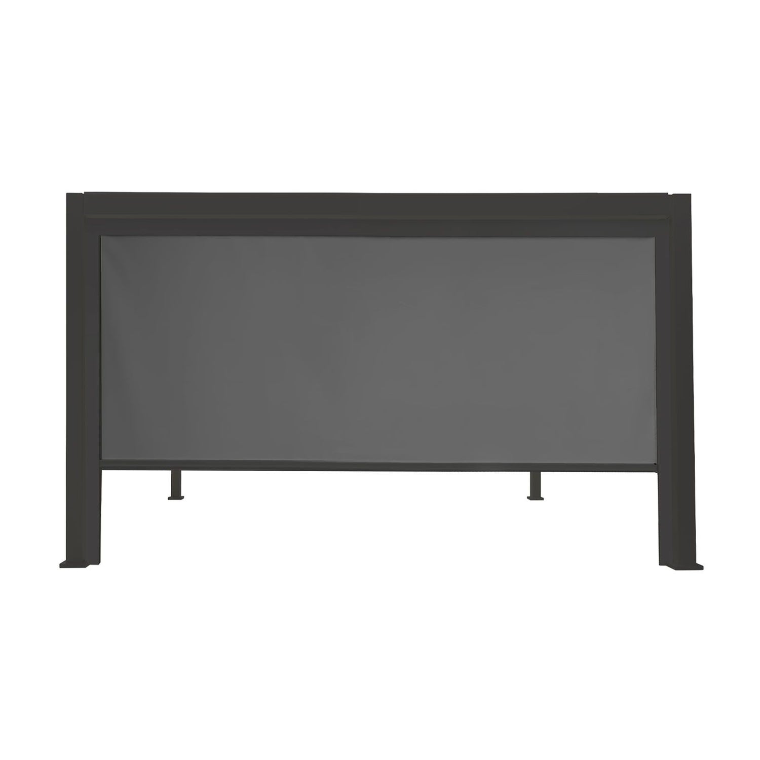 To securely attach the screen to your pergola, it utilizes an aluminum framework and an aluminum roller that must be skillfully affixed to the underside of the pergola and its legs. These components seamlessly clip into carefully aligned attachments. Comprehensive installation instructions are provided with the product. The aluminum framework is perfectly color-matched to your pergola, boasting an RAL code of 7015. When you wish to revert your pergola to its open configuration, simply push the screen back up into the aluminum roller for an effortless transformation.