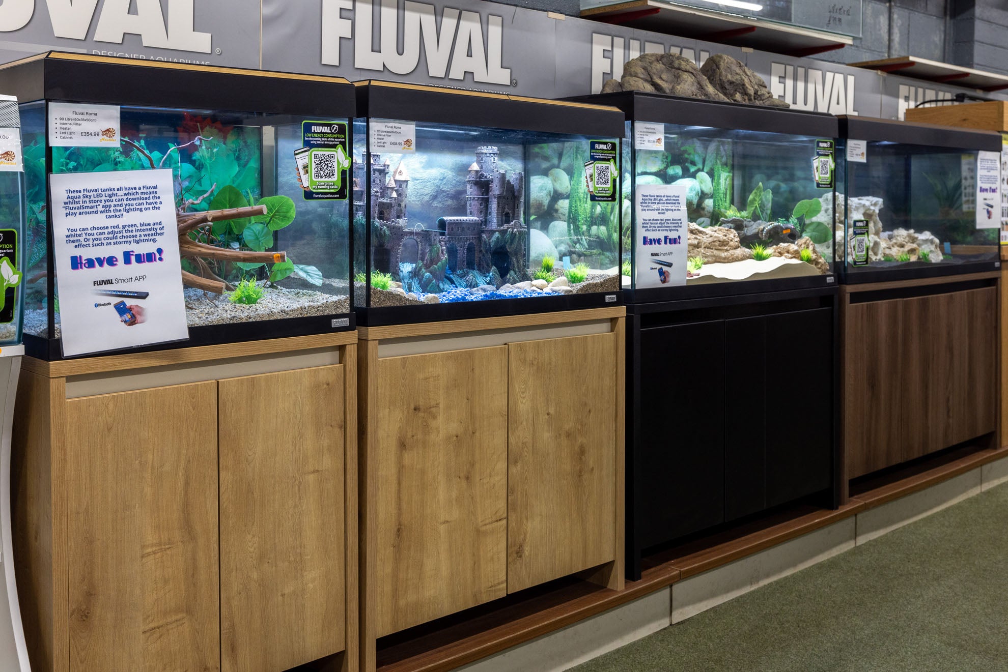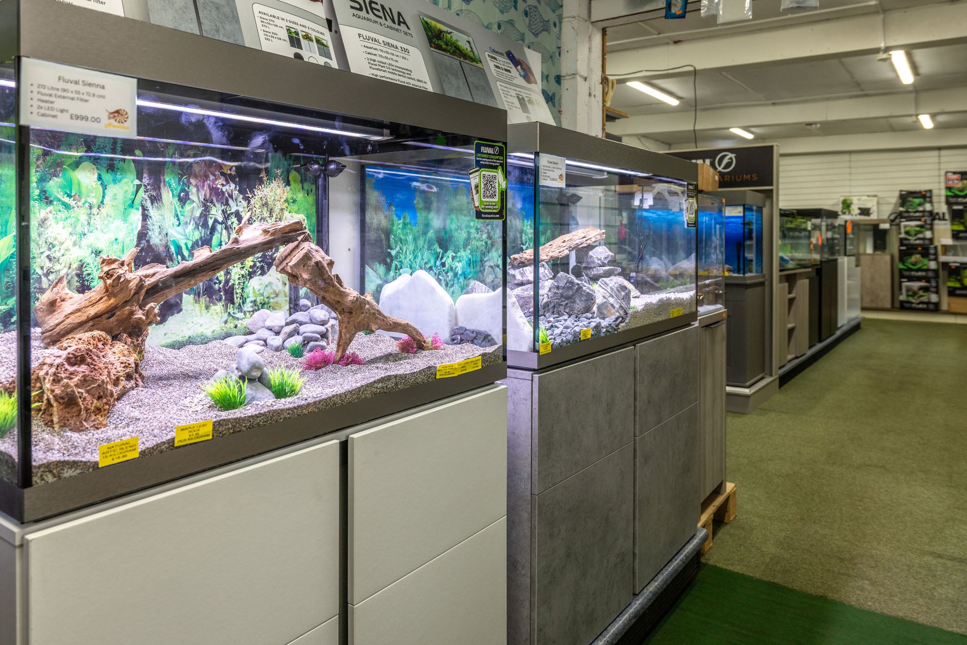 In store we keep a very large amount of dry goods. Fish tank equipment: filters, heaters, lighting, CO2 plant kits. Tank Decoration: gravel, fake plants, backgrounds, ornaments, air operated ornaments, rock, wood. We have a HUGE fish tank showroom with various sizes of tanks. Children's tanks, Nano tanks, Shrimp Tanks & Fighter fish tanks. We have tanks and cabinet deals. We have hexagon shaped tanks. We can also have a tank made to measure or made to made any shape needed. On the pond side we have preformed ponds and waterfall sections. We have pond pumps, filters, in-line U.Vs, pflexible pipe and solvent weld pipe and lots of fittings to go with, pond treatments, water treatments, a large selection of food, floating and sinking, we have a large area where we keep live pond plants.